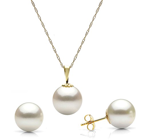 14K Gold White Freshwater Cultured Pearl Stud Earrings and Pendant Necklace Set, 18″ (Choice of Pearl Sizes and Metal Type)