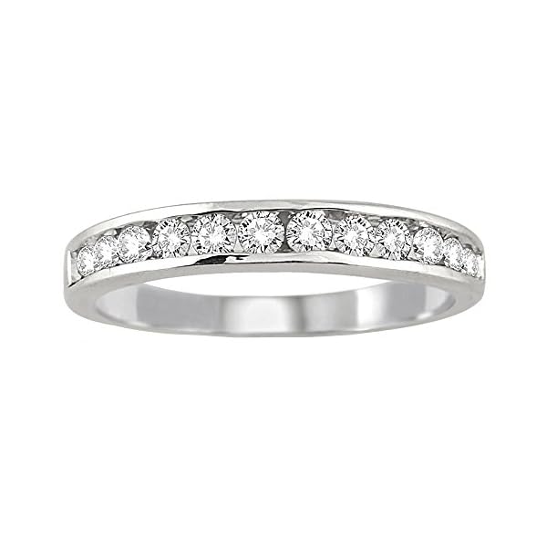 Sparkling diamonds, channel set in this easy yet classic band crafted in 10K white gold. A masterfully set ring highest if worn on my own or as an identical band to an engagement ring. The selection of diamonds vary between 11 and 13 stones in keeping with the precise stone and ring size throughout setting. The hoop is accompanied by an independently graded AGS (American Gem Society)Laboratory evaluation report certifying diamond quality.