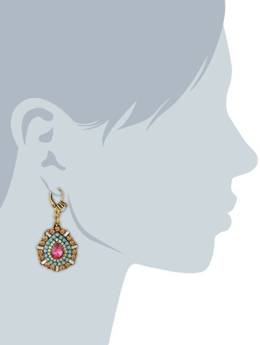 glossy gold tone teardrop-formed drop with multi-coloured crystal accents and beads, crystal accent at closure