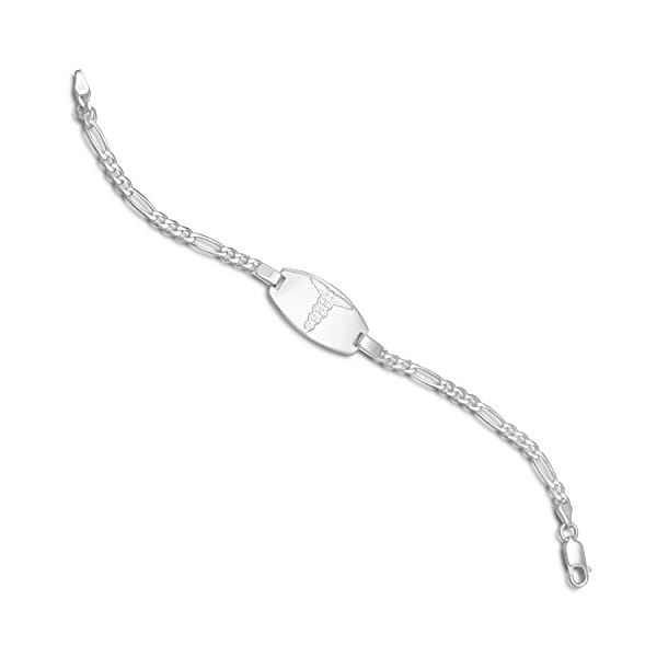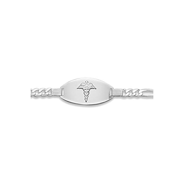 High quality Italian figaro chain bracelet is 4mm huge and has a 30mm x 16mm ID tag with the Scientific alert insignia. Engravable sterling silver, lobster clasp. To be had in 7-inch and eight-inch lengths.