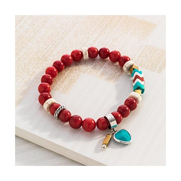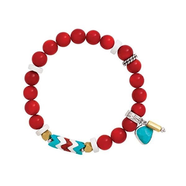 The chunky, red Under the Sun stretch bracelet is a seriously fun addition to your jewelry box (and so is its matching Under the Sun Necklace!). With a turquoise-toned charm and a unique chevron bead, this vibrant bracelet is a should-have for your beachy style or island getaway. Warm up with this bracelet that includes a mix of sterling silver and brass metals and coral and howlite beads totaling 92 5/8 ct. Piece comes with a “.925” sterling silver stamp as a symbol of guaranteed product quality.